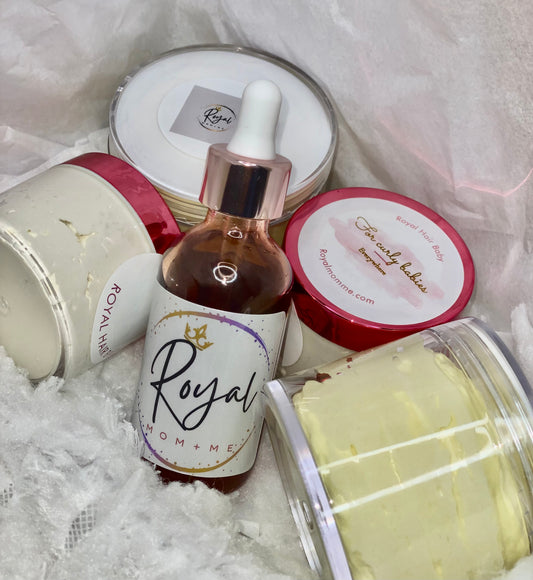 Royal Mom+ Me provides an amazing new collection of exclusive all natural products. Using our baby Hair Butter helps prevent moisture loss from your baby's hair. This will make it easier to smooth, brush, and style your baby's hair.